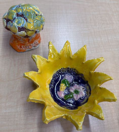 Students experiment with different clay forms (pinch pots, coil, slabs & tiles), design and patterning, red & white clays, rainbow color & bursting crystal glazes, and decorative materials (feathers, beads, ribbon, wire, pipe cleaners). They will learn how to mix glazes to create other colors, and see how crystal, crackle and textured glazes change the look of each creation after fired in a hot kiln. Clay and glazes used are non-toxic, and firings are done off-site in the instructor’s kiln (a teaching lesson!).